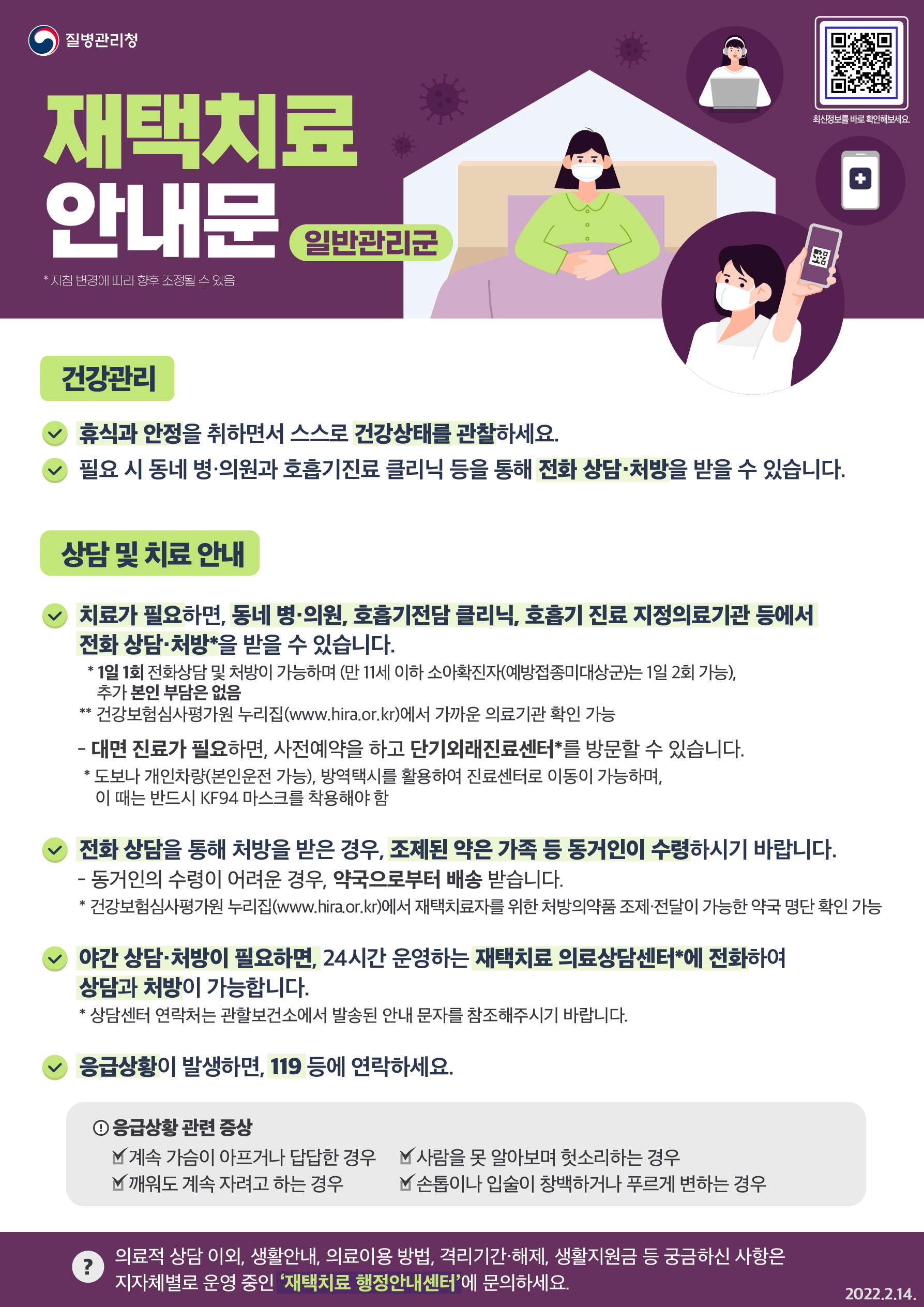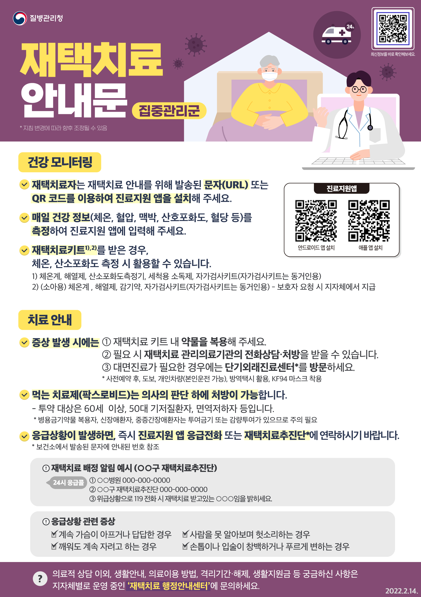 - 재택치료자(및 동거가족)의 격리 중 건강관리 및 주의사항, 생활 수칙등 필요 정보 안내