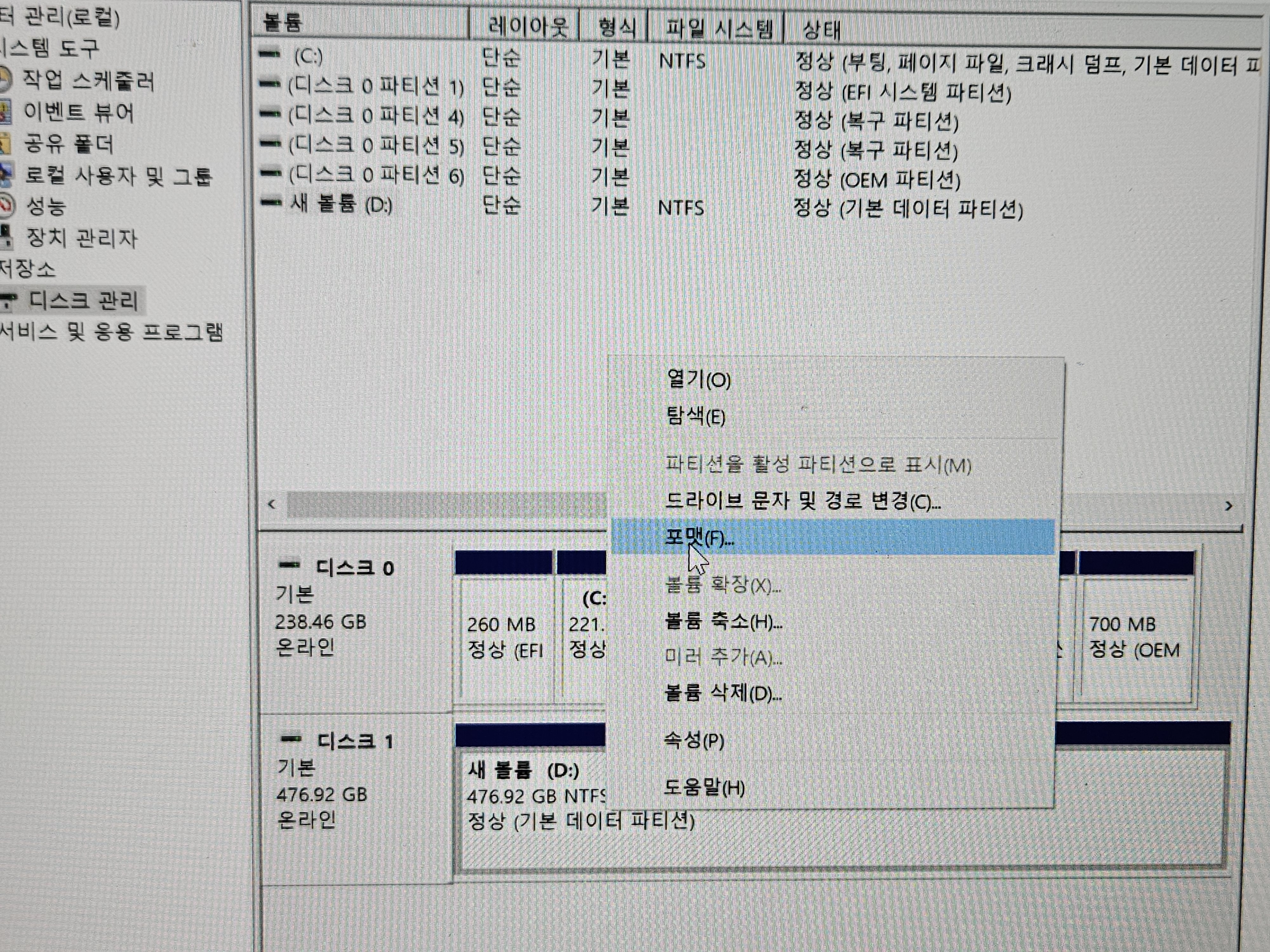 아랫부분에 디스크 1이라고 표시된부분에 포맷을 눌러 초기화 해줍니다