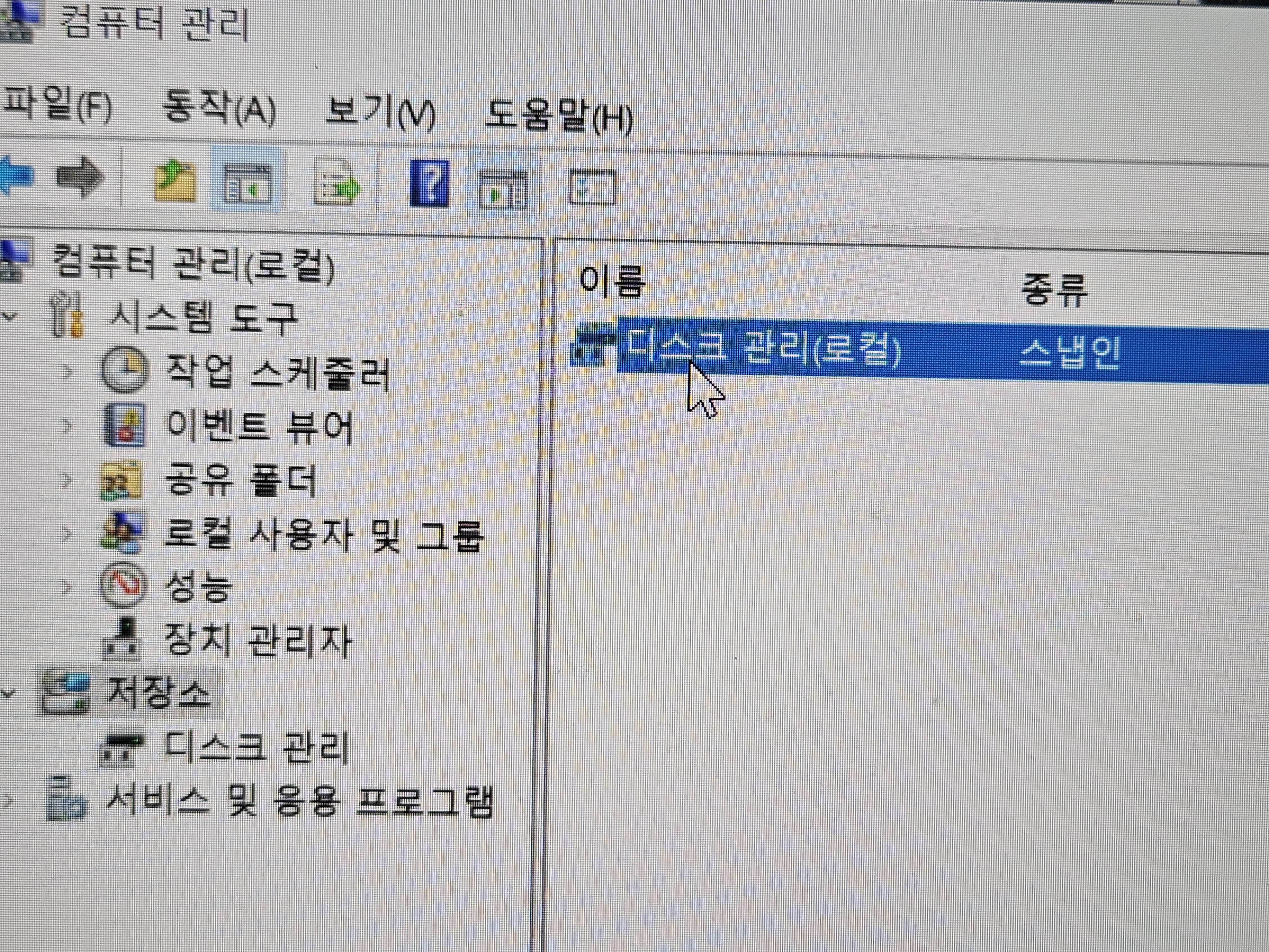 바탕화면에서 내컴퓨터 -오른클릭 -컴퓨터 관리로 들어갑니다